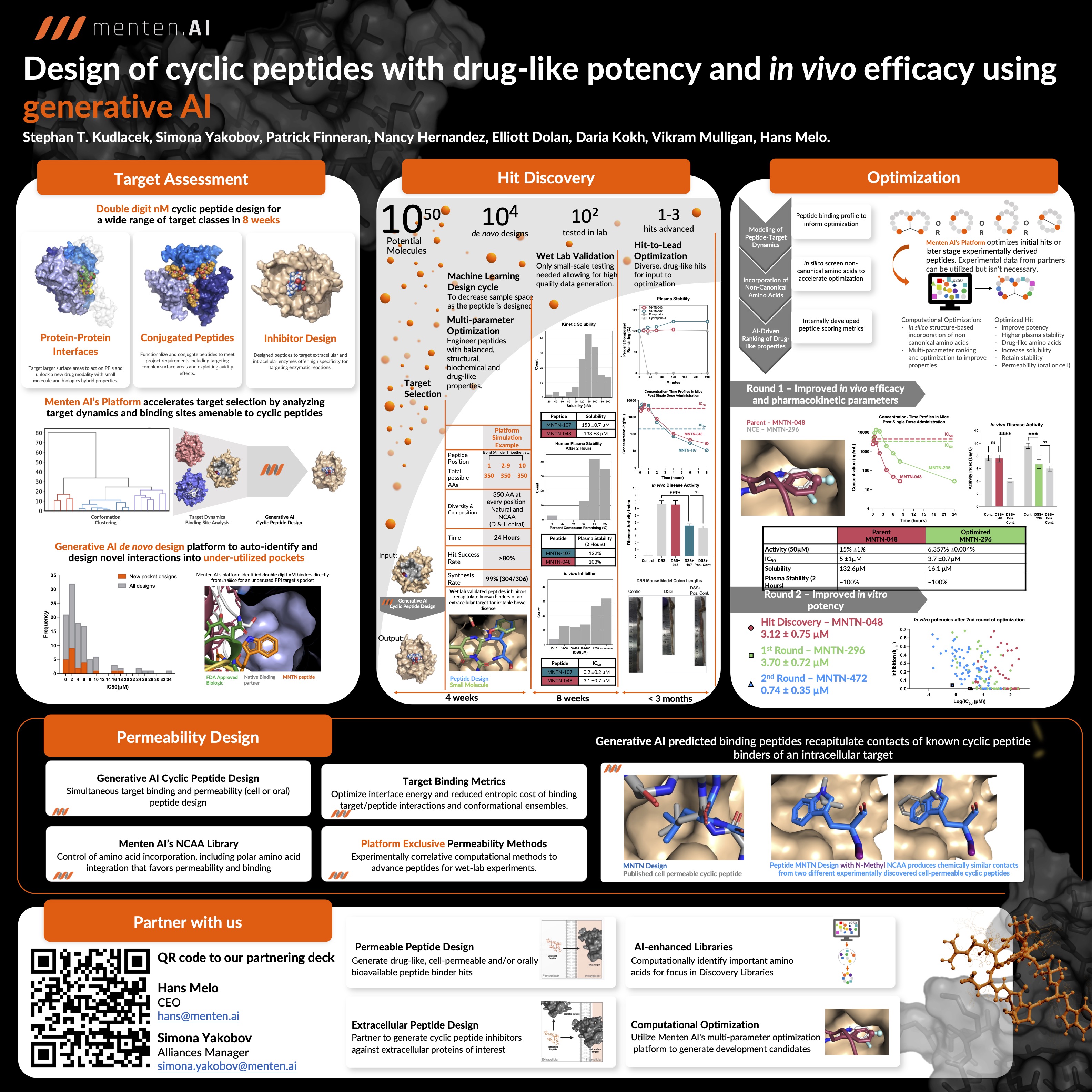 Our Associate Director Protein Design, Dr. Stephan Kudlacek, represented Menten AI at the 28th American Peptide Symposium (APS 2023) this year and discussed how Menten AI developed the world’s most advanced generative AI platform for the design and optimization of macrocyclic peptide therapeutics. In his poster presentation, Dr. Kudlacek addressed Menten AI's platform and how it overcomes historical challenges in peptide therapeutics. The poster walked potential partners through Menten AI's platform applications including our target assessment, hit discovery, and computational optimization capabilities. Menten AI's novel approach to design membrane permeable cyclic peptide binders was also discussed in the context of hard-to-drug therapeutic targets.